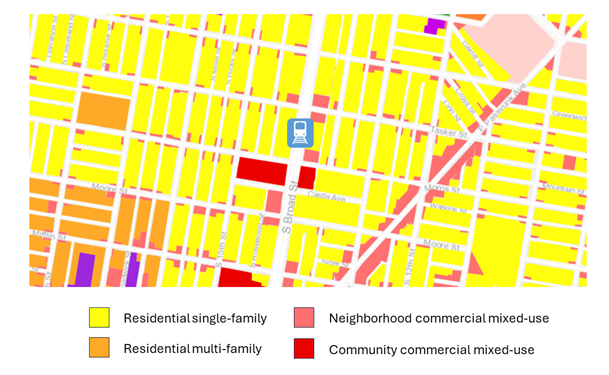 Most of the land around the Broad Street Line’s Tasker-Morris station is zoned for single-family housing (bright yellow). Source: City of Philadelphia’s OpenMaps.