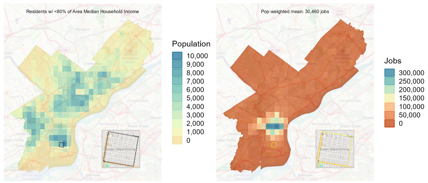 Number of Philadelphia residents with household incomes below 80% of the area median income in a given area (left) and number of jobs accessible by transit within 20 minutes from a given area (right). The angled squares (in black on the left and yellow on the right) indicate the Lower Moyamensing neighborhood. Source: NREL’s MEP tool.
