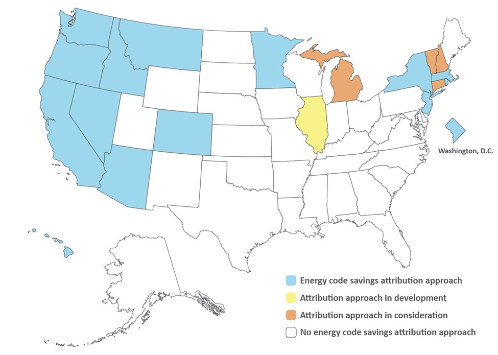 Figure ES1. States with energy code savings attribution approaches in place or in development