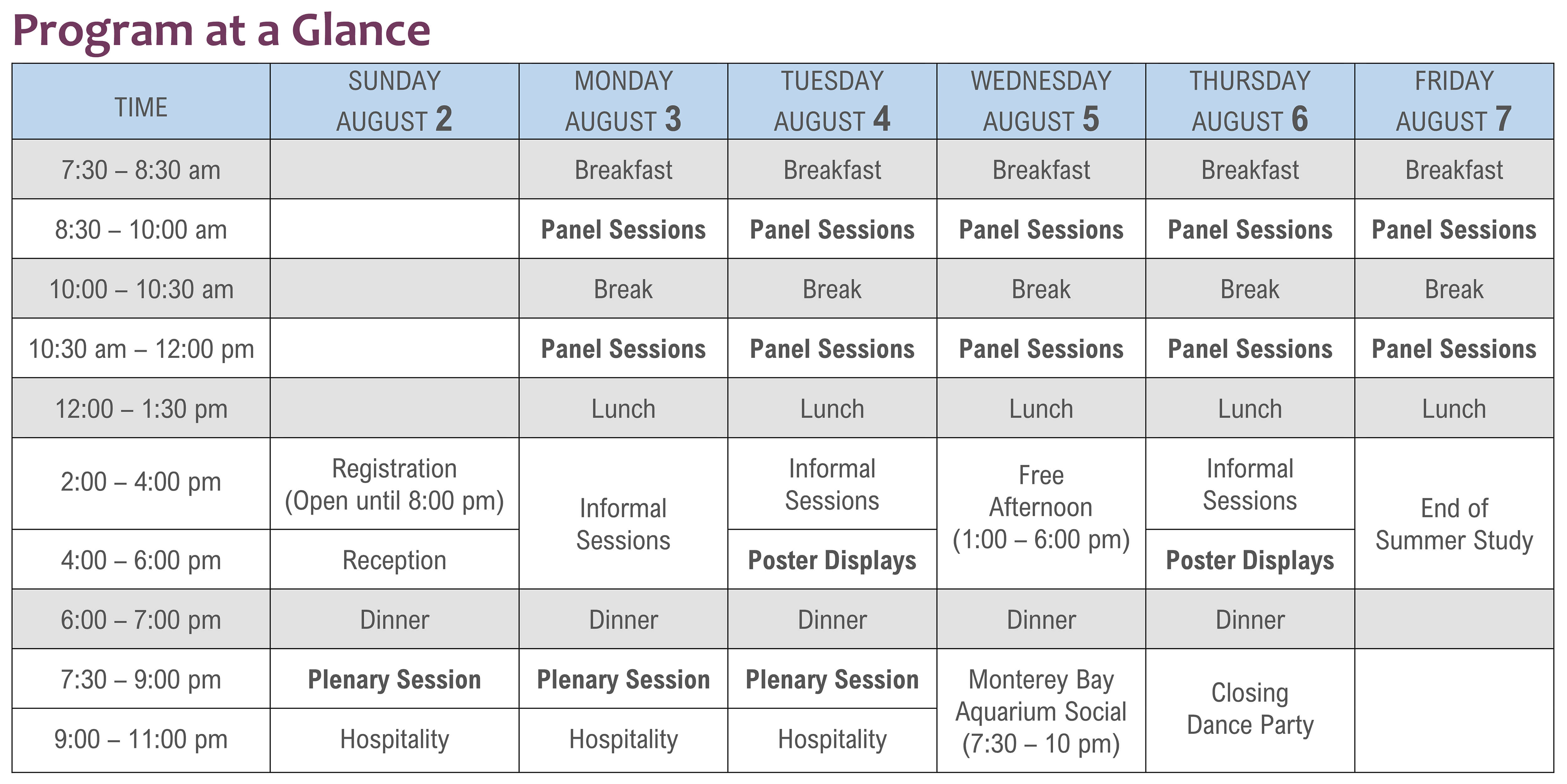Refer to the Program at a Glance table below for an overview of the conference week. More detailed Session Schedules and Full Program coming soon.