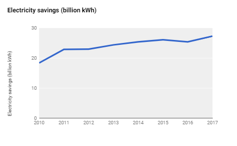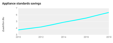 Efficiency performance standards for appliances, equipment, and lighting are expected to save the United States a total of 71 quads of primary energy cumulatively by 2020. In comparison, the United States consumed about 98 quads of primary energy in 2017. Performance standards ensure that all products sold in the country meet a minimum level of efficiency. The United States has set standards for more than 60 products that are expected to save consumers more than $2 trillion on their energy bills cumulatively by 2030, and save a typical household over $500 in energy bills in that year. The graph shows annual savings from appliance standards in recent years.