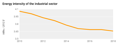 The US industrial sector includes manufacturing, agriculture, mining, and construction. Energy intensity is the energy consumed per each dollar of goods produced by industry. A number of factors influence industrial energy intensity, including the type of manufacturing, industry structure, and energy efficiency. As the graph shows, US industrial energy intensity has been improving steadily. A lower number indicates that less energy is needed per dollar of goods produced.