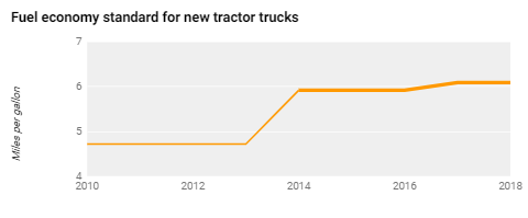 Roughly a third of transportation energy in the United States is used to move goods rather than people. Although the sector is complex, the largest energy use is by long-haul tractor trucks, the large freight-hauling trucks with sleeper cabs. For simplicity we look at the average fuel economy required for those trucks. The first fuel economy standards for trucks and buses, adopted in 2011, took effect in 2014, as shown in the graph. In August 2016 the U.S. Environmental Protection Agency and the Department of Transportation issued a second set of standards for trucks and buses through 2027. We estimate that under these standards long-haul tractor truck fuel economy will increase to 8.2 mpg by that year. The fuel efficiency of other freight modes (rail, air, ships) also is increasing, but more slowly.