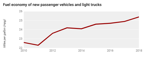 Fuel economy measures how far cars and light trucks can travel on each gallon of fuel. Small gains in average miles per gallon lead to large savings nationally. Thanks to regulation and improved technology, the fuel economy of the average vehicle has been on the upswing since the mid-2000s after decades of stagnation. The fuel economy of diesel, gasoline, electric, and hybrid vehicles differs greatly. The graph shows the average fuel economy of all new passenger cars and light trucks sold in a given year. The fuel economy numbers differ from automaker standards compliance levels; they are adjusted to reflect real-world performance.