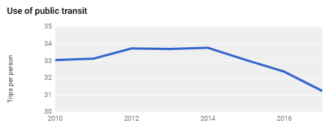 When we use it well, public transportation is generally more energy efficient than passenger cars. Large groups of people can ride together instead of everyone driving their own car to the same destination. After years of increases, the number of public transportation trips in the United States has been dropping in recent years, in part due to new alternatives and lower fuel costs. The graph shows the number of recorded trips taken on public transportation per capita in the United States.
