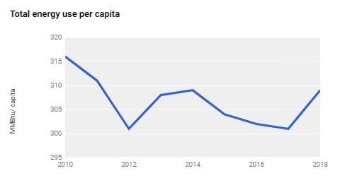 Energy use per person can vary widely with income level, geography, climate, and demographics. The graph shows energy use per capita in all the economic sectors in the United States in recent years. The decrease is mostly due to reduction in residential energy consumption in recent years.
