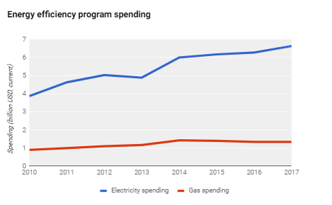 Energy efficiency programs require upfront costs. Among a number of financing strategies, small charges levied on customer utility bills are the single largest source of funding for US energy efficiency programs. Administered by utilities or contracted to third parties, these energy efficiency programs involve customers in projects ranging from simple lighting replacements to whole-building retrofits. The graph shows annual customer-funded expenditures on US electricity and natural gas efficiency programs, which have been rising since a low in 1998.
