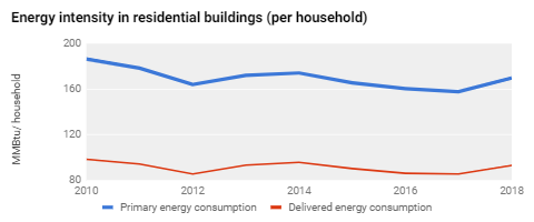 One way to measure energy efficiency in residential buildings is to evaluate the total primary energy or source energy consumed per household. Primary energy includes the energy consumed directly in the buildings along with the losses incurred in the generation, transmission, and distribution of that energy. Delivered or site energy is the energy consumed by buildings on site, as reflected by a utility bill. About 50% of the energy used in residential buildings goes toward space heating, cooling, and water heating, which are influenced by climate and the size of the house, as well as energy efficiency. The graph shows primary and delivered energy per household in residential buildings.