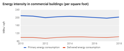 Commercial buildings include office, retail, education, storage, services, food sales, religious worship, and healthcare buildings. While these range widely in their energy consumption, heating, lighting, and cooling take close to half of the energy consumed by all commercial buildings. We express energy efficiency in these buildings as energy used per unit of floor area (called energy use intensity or EUI). We can report EUI either for primary or delivered energy as discussed above for residential buildings.