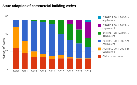 Model energy codes establish the minimum energy standards for the design and construction of new buildings. Thus they facilitate and standardize building energy efficiency practices. From 1992 through 2012, these codes saved over $44 billion dollars in energy costs through the avoided use of 4 quads of energy. A quad is a quadrillion British thermal units (Btu). By way of comparison, 4 quads is more than all the energy consumed by Poland in 2015. Energy codes are set by states and sometimes local governments based on model codes from ASHRAE and the IECC, and are revised periodically. The graphs show an increasing number of US states with updated state-level building codes for residential and commercial buildings.