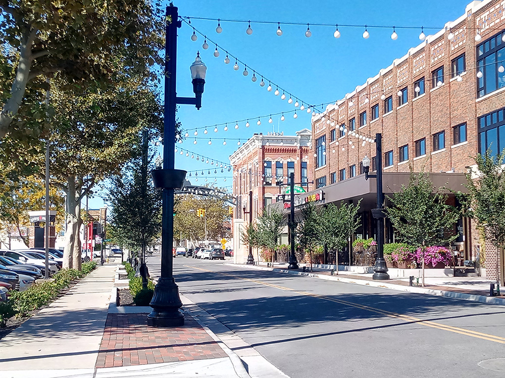 Above: Spring Street near the intersection with Main Street in downtown Lima. In 2023 and 2024, as part of downtown revitalization efforts, the City of Lima worked to implement streetscape improvements on Spring Street, including a new midblock pedestrian crossing, curb extensions, bistro lights, new trees, an archway, and removable bollards for events.