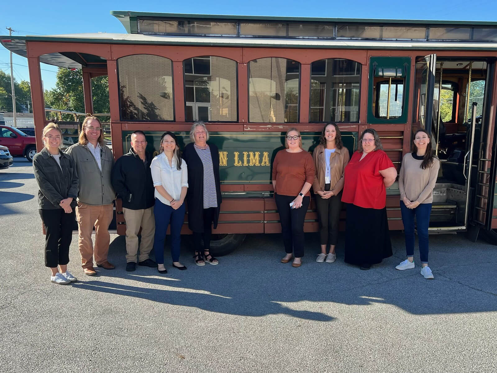 Representatives from the Lima TCP team gather for a group photo in October 2024. From left to right: Jackie Lombardi (RMI), Ian Kohli (City of Lima), Dave Louth (City of Lima), Christi Nakajima (ACEEE), Karen Garland (RTA), Megan Kinnear (Lima-Allen County Regional Planning Commission), Jessica Begonia (City of Lima), Tonya Dye (Lima-Allen County Regional Planning Commission), and Caroline Daigle (ACEEE).